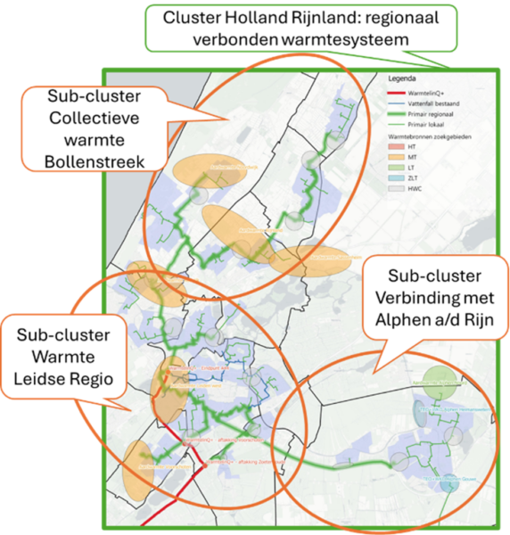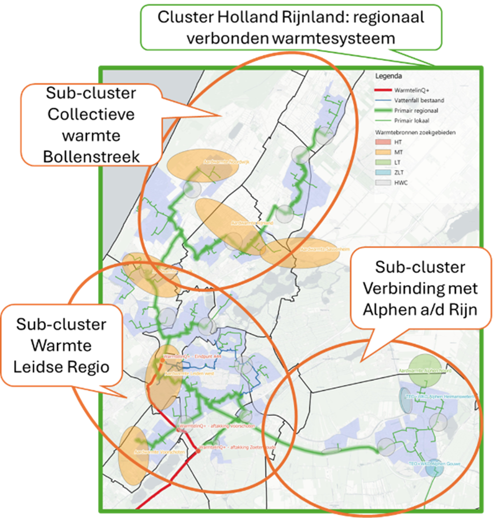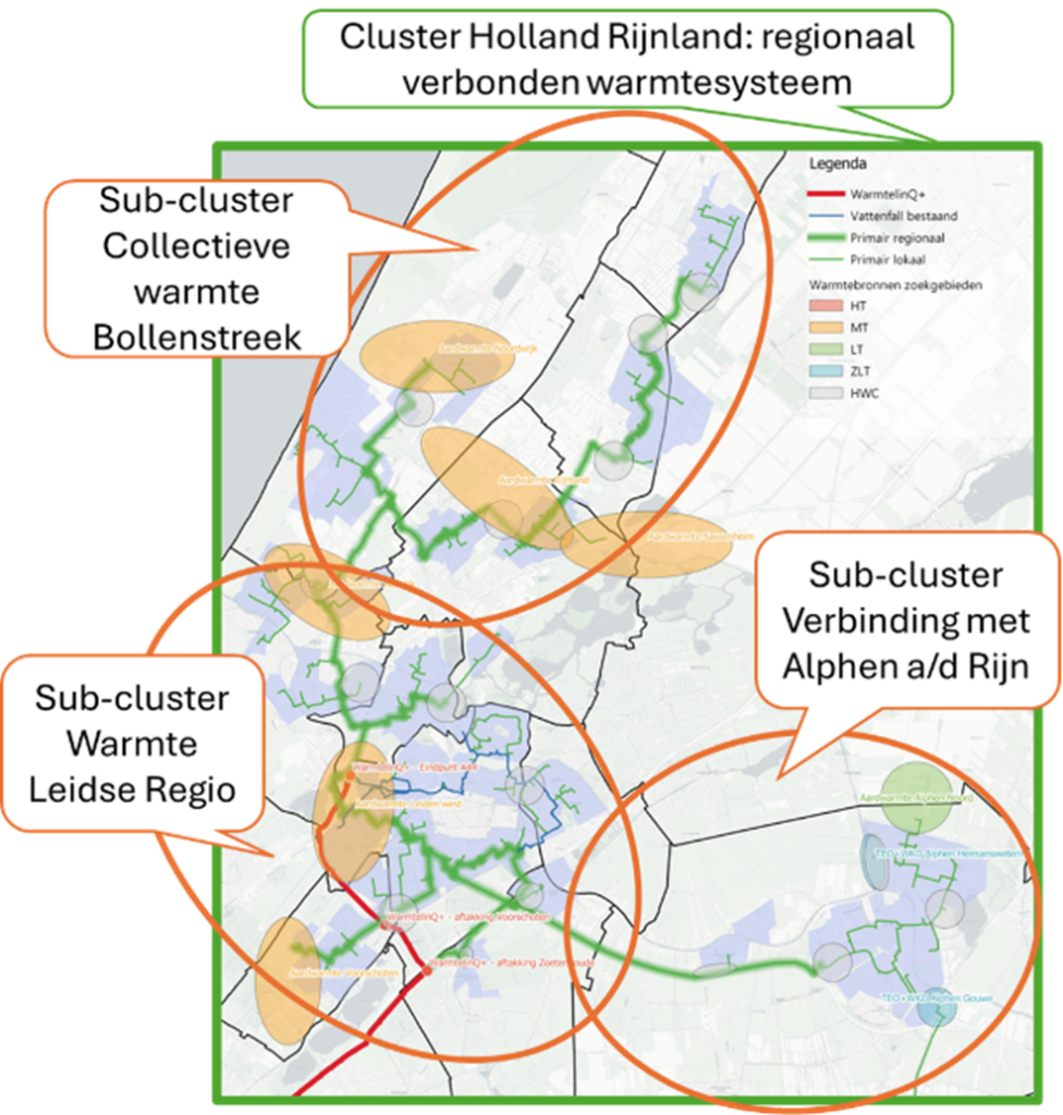 Tijdens een bijeenkomst met vertegenwoordiging van gemeenten uit Regio Holland Rijnland, Liander, Firan, EBN, D4 en Holland Rijnland Wonen hebben AT Osborne, Rebel en RVO het onderzoek naar een regionale clusteraanpak toegelicht. Daarbij is een eerste inventarisatie gemaakt van concrete projecten die in de regio klaar staan, om aansluitingen op warmtenetten te gaan realiseren. De clusterdeal is een belangrijke stap naar het gezamenlijk realiseren van het regionaal verbonden warmtesysteem Regio Holland Rijnland (zie figuur).