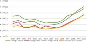 De prijzen in de koopsector zijn na een daling als gevolg van de vorige crisis in het begin van het vorige decennium vanaf 2015 weer sterk toegenomen. Inmiddels liggen de gemiddelde transactieprijs in de regio tussen de € 330.000,- in Subregio Oost en € 400.000,- in Subregio West (zie figuur 2).