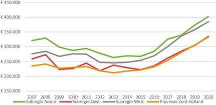 De prijzen in de koopsector zijn na een daling als gevolg van de vorige crisis in het begin van het vorige decennium vanaf 2015 weer sterk toegenomen. Inmiddels liggen de gemiddelde transactieprijs in de regio tussen de € 330.000,- in Subregio Oost en € 400.000,- in Subregio West (zie figuur 2).